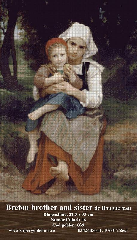 Goblenul ” Breton brother and sister “, are dimensiunea de 22,5 x 33 cm si contine un numar de 46 culori. Acest goblen este o reproducere dupa o pictura celebra a pictorului William – Adolphe Bouguereau ( 1825 – 1905 ). Nascut in La Rochelle Franta intr-o familie de negustori, pictorul Bouguereau a demonstrat talentul artistic de la o varsta frageda, abordand un gen de pictura realist, punand accent pe forma corpului uman feminin, pictand portrete de femei frumoase si gratioase, aducand la viata personaje cu teme mitologice ca zeite, nimfe. Bouguereau a fost considerat unul dintre cei mai mari pictori ai lumii, tablourile sale, ( opt sute doua zeci si sase la numar ) impodobesc galeriile a aproape o suta de muzee de arta din intreaga lume.