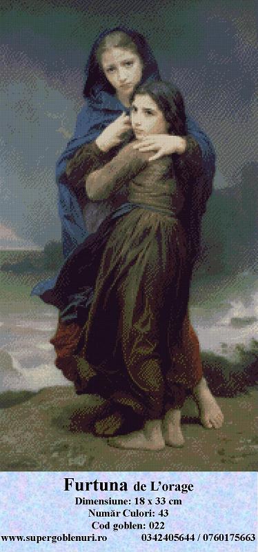 Goblenul “Furtuna ” are dimensiunea de 18 x 33 cm si este realizat cu ajutorul unui numar de 43 culori. Acest goblen este o reproducere dupa o pictura celebra numita “L-Orage”a pictorului francez William Bouguereau, un pictor traditionalist cu picturi de gen realist, care a pus in prim plan in picturile sale atat personaje din teme mitologice (zeite, nimfe ), cat si portrete de femei frumoase si fermecatoare, abordand o concentrare mare asupra corpului uman feminin, un stil propriu de redare exacta a formei umane. Prestigiul si faima pictorului William Bouguereau se regasesc in cele opt sute doua zeci si sase de tablouri pictate, fiind considerat unul dintre cei mai mari pictori din lume, un tehnician competent prin stilul artistic, care se rezuma la gust si rafinament, picturile sale fiind expuse in peste o suta de muzee in intreaga lume.