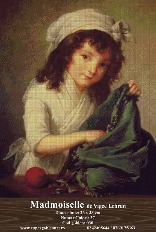 Goblenul – Mademoiselle are dimensiunea de 26 x 33 cm si contine un numar de 37 culori. Acest goblen reprezinta portretul unei fetite care cauta jucarii in posetuta, si este o reproducere dupa o pictura celebra a pictoritei Marie Louise Elisabeth Vigee Le Brun (1755 – 1842). Nascuta la Paris, Franta, si avand ca model artist pe tatal ei tot pictor, Elisabeth Le Brun invata sa picteze de la o varsta frageda, isi insuseste o reputatie impresionanta prin pictarea unor portrete ale Contelui Orloff si ale Ducesei de Orleans, si este admisa la Academie in 1783. La inceputul Revolutiei din Franta, se muta pentru o perioada in Italia unde lucreaza la Roma si Napoli, apoi calatoreste la Viena, Berlin si St Petersburg revenind la Paris in 1802 unde ramane pentru tot restul vietii. Vigee Le Brun a onorat o serie de comenzi, si a creat o intreaga serie de portrete reprezentand-o pe Marie Antoinette. In 1830 ea a publicat memoriile sale care cuprind informatii referitoare la calatoriile ei si cariera artistica.