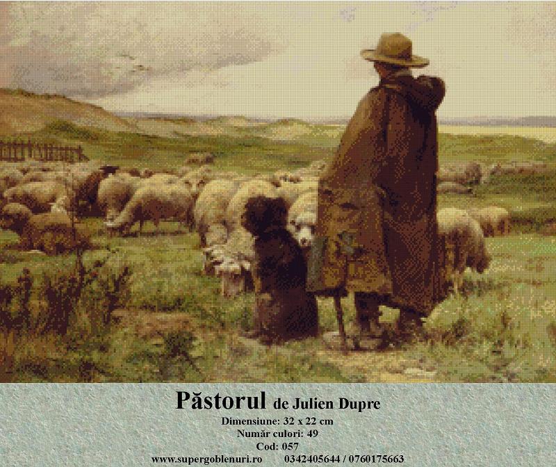 Goblenul “Pastorul “,are dimensiunea de 32 x 22 cm si contine un numar de 49 culori. Acest goblen este o reproducere dupa o pictura celebra numita “The shepherd “a pictorului francez Julien Dupre (1851 – 1910), renumit pentru talentul deosebit de a asterne lumina naturii pe panza, fie ca este lumina filtrata printr-un grup de copaci, cat si baia calda a soarelui stralucitor rural. Artistul Julien Dupre este considerat unul dintre cei mai mari pictori realisti de la jumatatea secolului al XIX-lea. De-a lungul carierei sale a pictat modul de viata al taranilor si scene rurale din domeniile din Normandia si Bretania, pana la moartea sa in aprilie 1910. Picturile sale au devenit parte din colectiile mari ale secolului al XIX-lea, multe din aceste colectii la randul lor au devenit pietre de temelie ale muzeelor mari din lume.